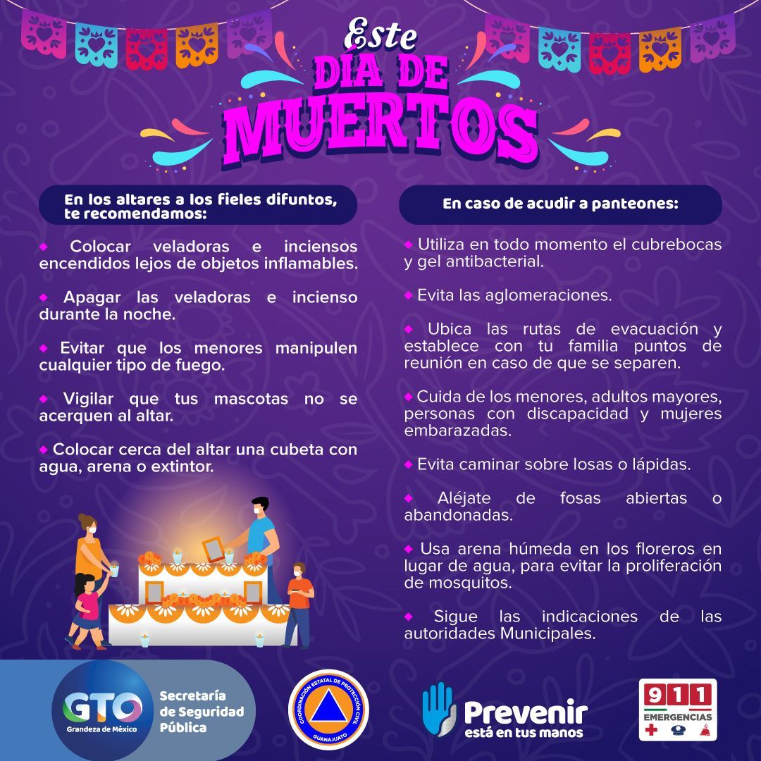 Guanajuato, Gto., 30 de octubre de 2022 .- Con el propósito de mantener el orden y salvaguardar la integridad física de las personas que acudan a los panteones en la entidad, la Secretaría de Seguridad Pública del Estado (SSPE) implementará en coordinación con los 46 municipios del estado, un operativo de seguridad y vigilancia con motivo de la celebración del Día de Muertos.
